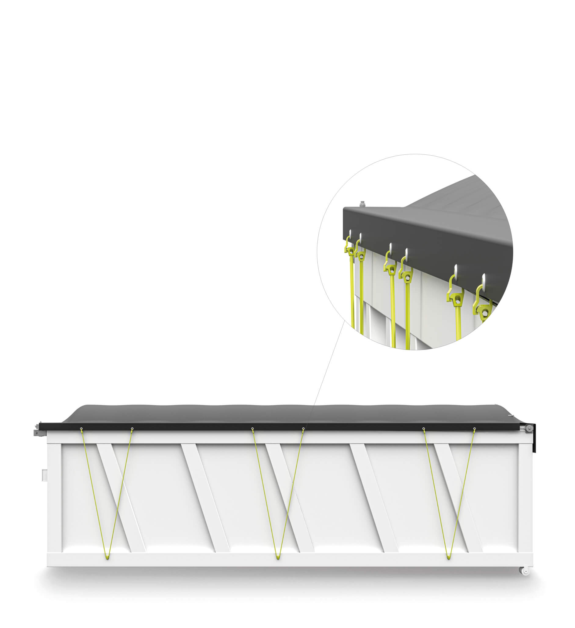 Das windfeste System mit Gummispanner und verzinkten Stahlkarabinern gewährleistet eine schnelle und sichere Befestigung der Abdeckung, sowohl in geschlossener als auch geöffneter Position. Die an den Bogenfüßen verankerten Gummibänder sorgen für Halt und Stabilität und fügen sich in die tragende Struktur aus Bögen und Hebevorrichtungen ein. Die Anzahl der Gummispanner variiert je nach Länge der Ladefläche und der Konfiguration der Abdeckung.