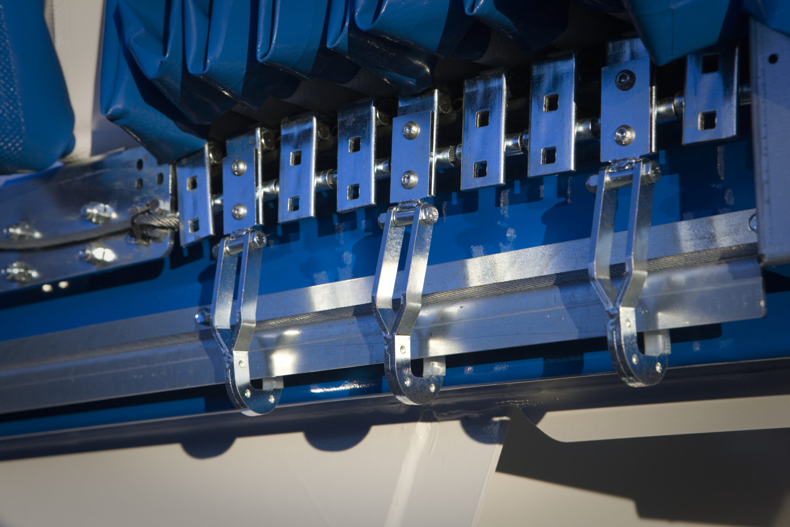 Lo sgancio rapido della fune installato al posto del “rinvio posteriore con tensionamento” permette di liberare completamente le sponde dalla fune per agevolare le operazioni di carico e scarico delle casse bilaterali e trilaterali: può essere fornito per un solo lato della cassa o per entrambi. Facile da installare e rapido da utilizzare è il modo più semplice per sganciare la fune anche durante la manutenzione della copertura.